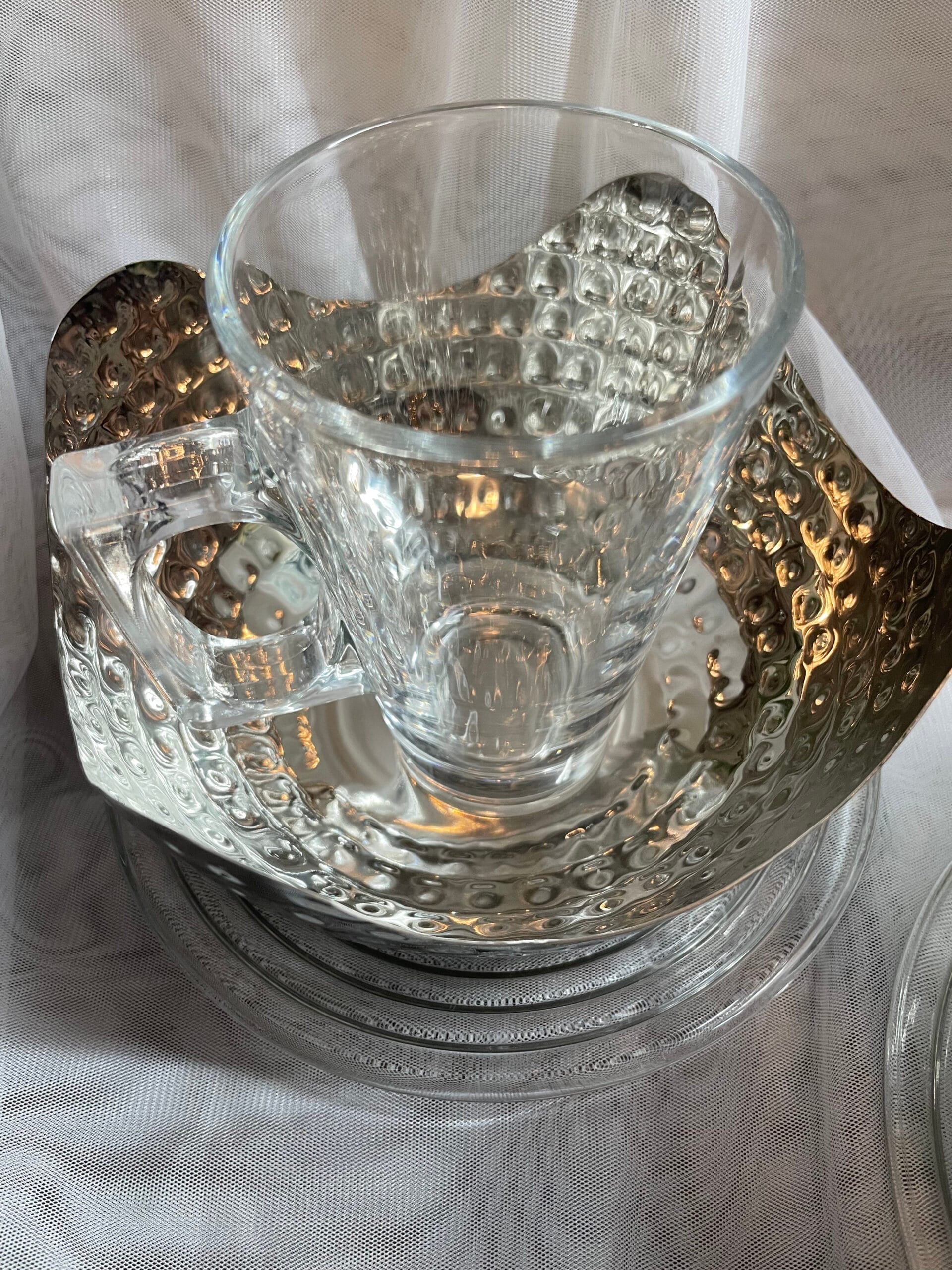 Set of 2 glass coffee cups + 2 metal saucer-style bases