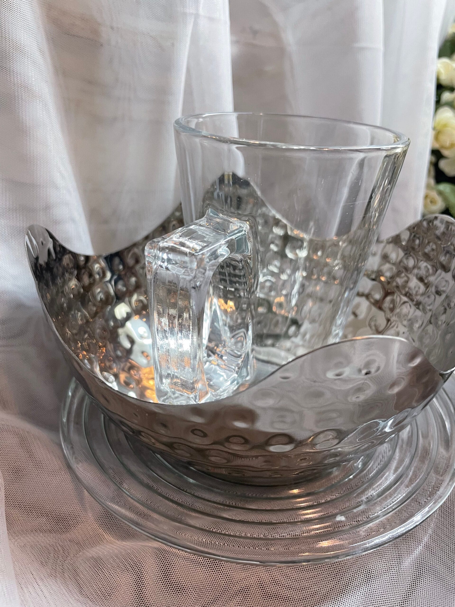 Elevate your coffee moments with this Glass Coffee Cup Set with Metal Base — a sleek, modern duo designed for style, function, and moments worth sharing. Each set includes two crystal-clear glass coffee cups paired with elegant metal bases that double as small trays — perfect for serving cookies, fruit, or a chocolate treat.